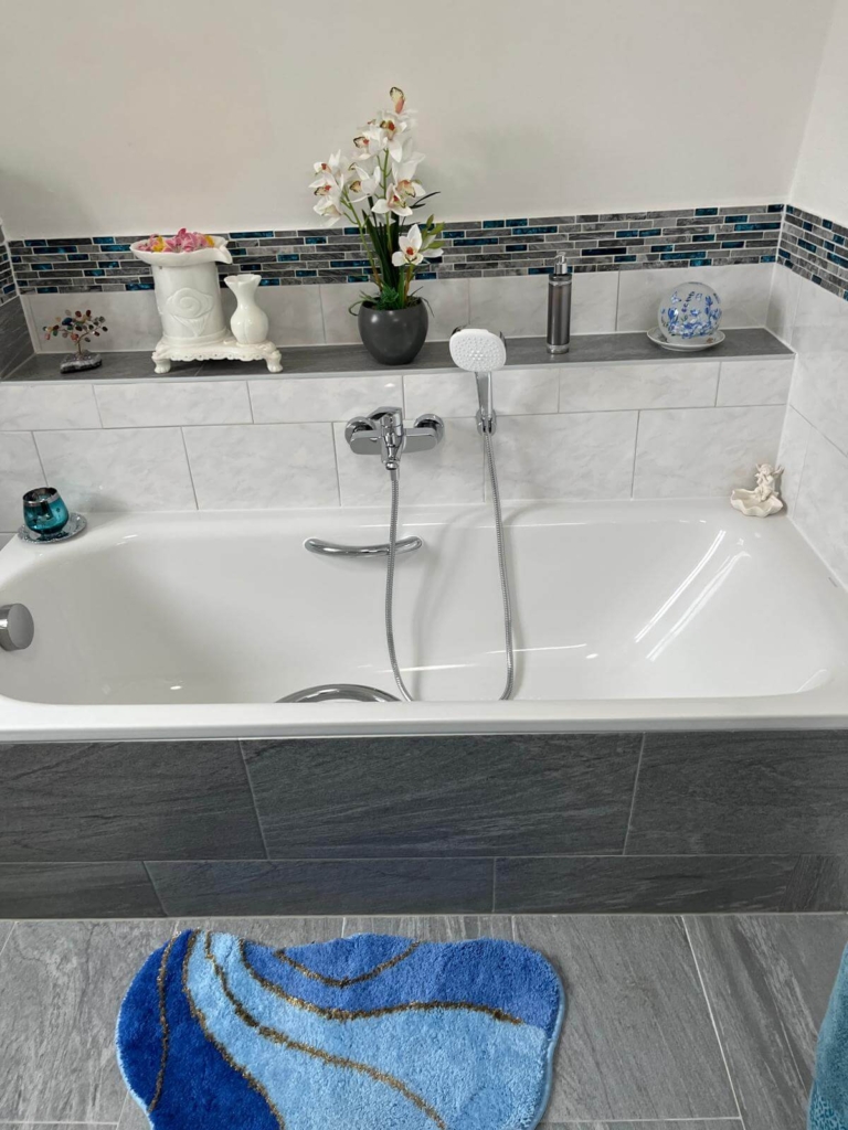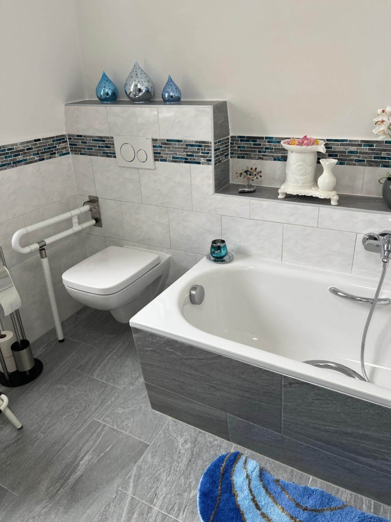 Die neue Ausstattung umfasst eine großzügige, begehbare Dusche mit integrierter Sitzbank und Haltegriffen. Ein besonderes Detail für mehr Sicherheit: Die neue Badewanne ist mit einer speziellen Anti-Rutsch-Beschichtung ausgestattet. Elegante Fliesen und ein modernes Waschtisch-Ensemble runden das Raumkonzept ab.
