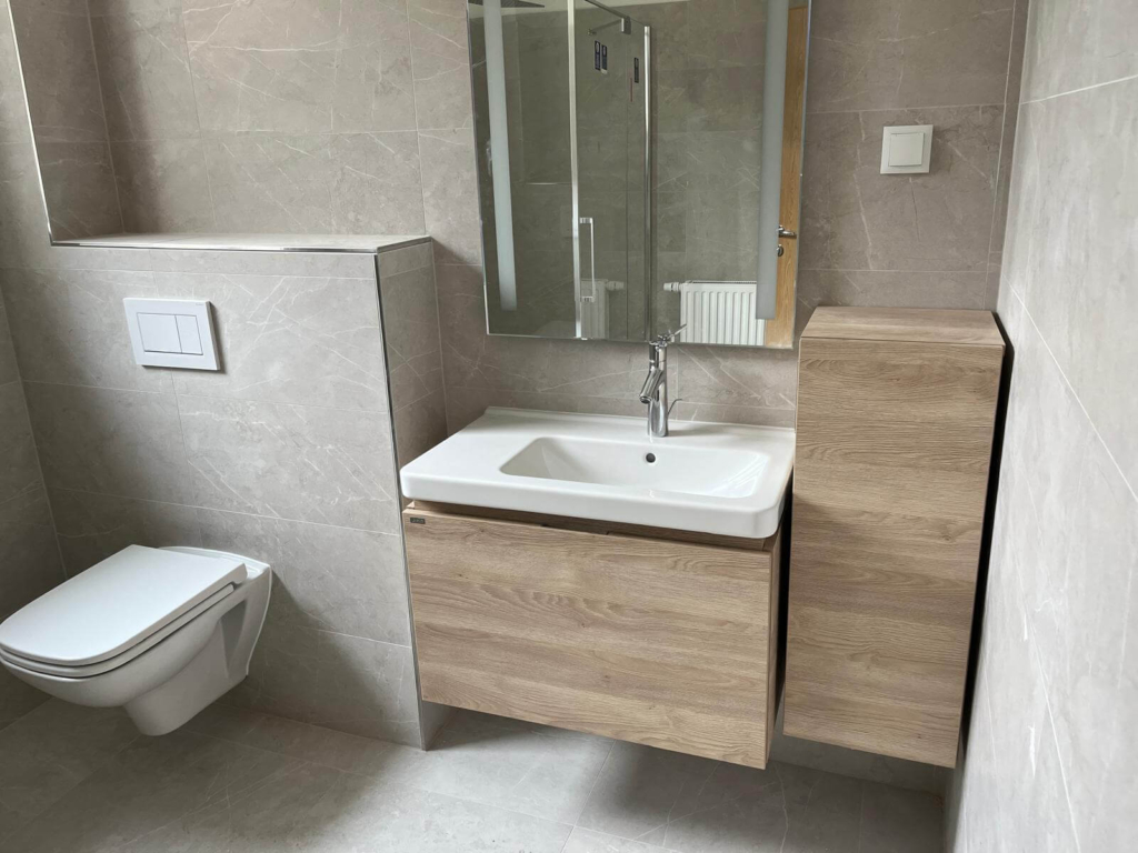 Wir haben eine bodenebene, begehbare Dusche mit Glasabtrennung installiert, ein modernes Hänge-WC montiert und die Waschplatzlösung inklusive Spiegel und Beleuchtung integriert. Die großformatigen Fliesen in Naturstein-Optik runden das moderne Gesamtbild ab.