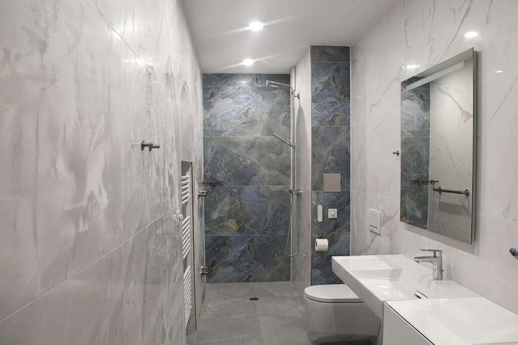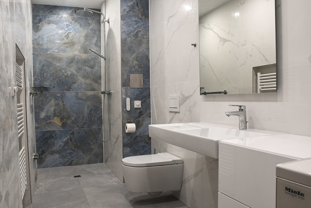 Die Ausstattung umfasst eine großzügige, bodengleiche Dusche mit dezenten Haltegriffen sowie ein modernes Geberit Dusch-WC, das den Hygiene-Standard erheblich steigert. Die Kombination aus hellem Marmor und tiefblauen Naturstein-Akzenten sorgt für eine beeindruckende Optik.