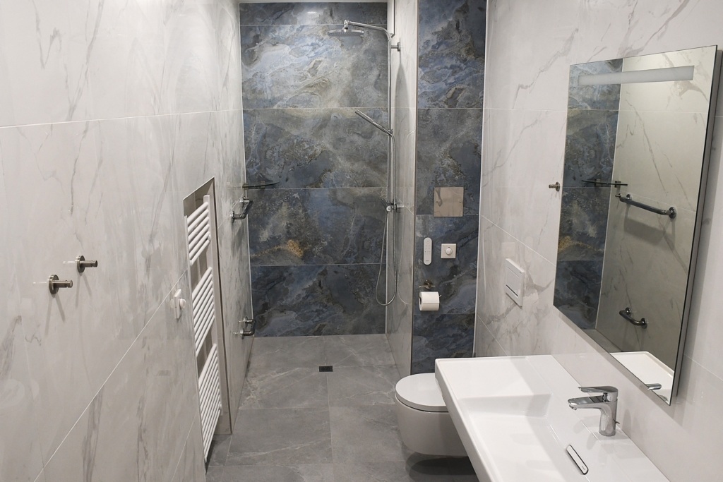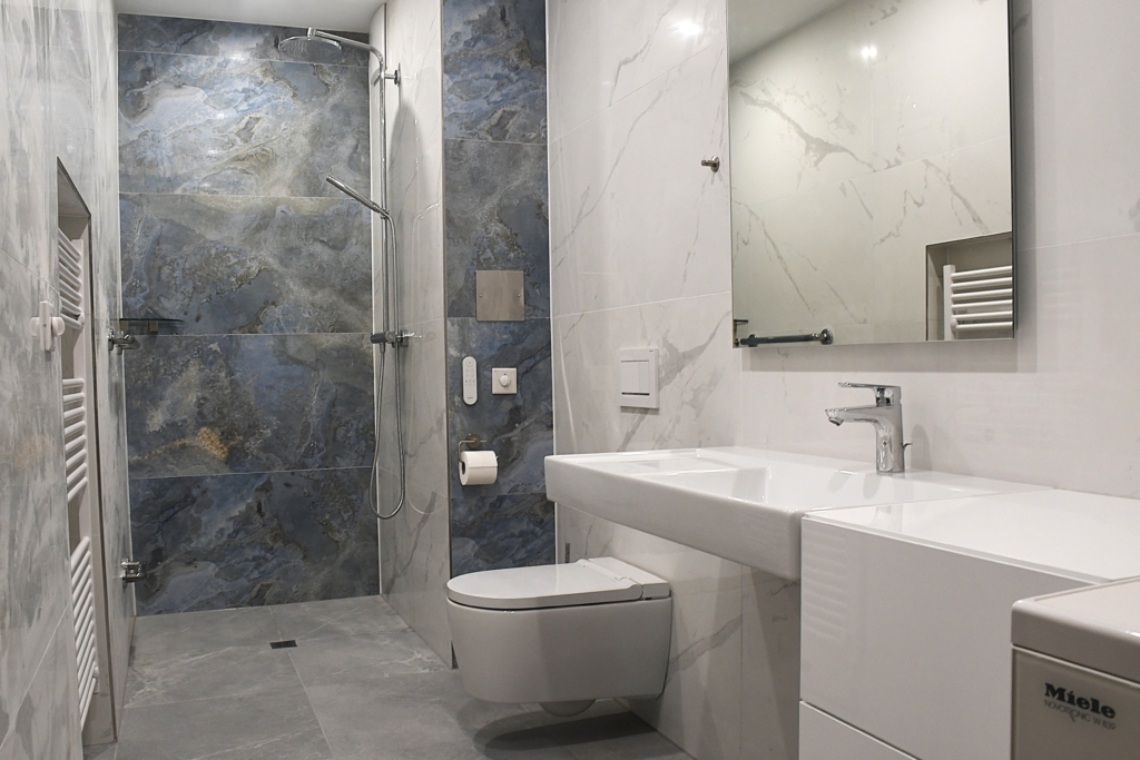 Barrierefreie Dusche mit Design-Akzent: Wir haben eine großzügige, bodengleiche Dusche installiert, die maximale Zugänglichkeit und einen nahtlosen Look bietet. Für zusätzliche Sicherheit und Komfort wurden dezente, Haltegriffe montiert. Die Kombination aus hellem Marmor und tiefblauen Naturstein-Akzentfliesen sorgt für eine beeindruckende Optik.
