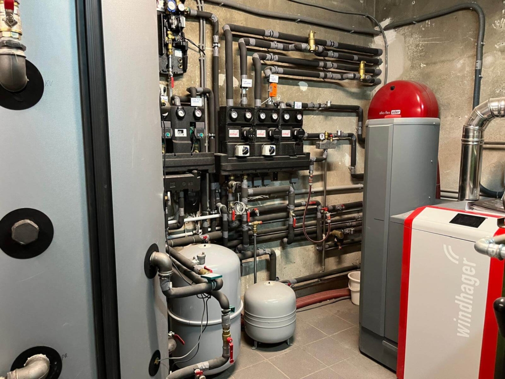 Die Installation umfasste den Hochleistungs-Pelletkessel, Pufferspeicher für optimale Energienutzung sowie die komplette hydraulische Verteilung.